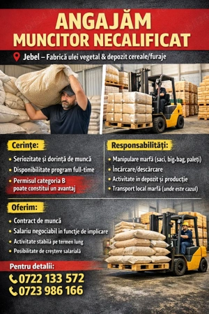 Angajam muncitor și manipulant mărfuri și minime cunoștințe de mecanica, la o fabrica de ulei si furaje. Postul nu necesita experienta, dar mici cunostinte de mecanica, indemanare si permisul de conducere constituie un avantaj. Oferim salariu atractiv, munca relaxata si un mediu de lucru prietenos. Tel. ...