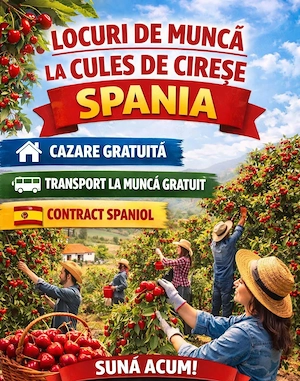 Este nevoie de 4 persoane la rărit de cireșe in spania Fără masina personala Alte detalii pe whatsapp Nu preluăm din zalău sibiu caraș severin bucuresti Plecare 21 aprilie Se oferă transport cu retinere la salariu ATENTIE preluam doar cu rezervări nu pr.cont propriu Start înscrieri Nu ...