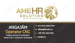 ANGAJĂM URGENT Operator CNC cu experiență Industria Automotive, Șura Mică, Jud. Sibiu Contract: pe perioadă nedeterminată Program: 3 schimburi: 06:30 14:30 14:30 22:30 22:30 06:30 Cerințe: Studii medii Calificare Operator CNC Experiență pe un post similar Disponibilitate de a lucra în 3 schimburi Ce ...
