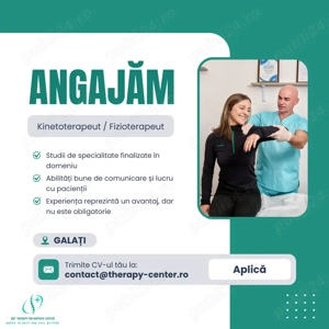 Art Therapy Otrthopedic Center angajeaza. Ce cautam de la tine? Studii de specialitate finalizate in domeniu. Abilitati bune de comunicare si lucru cu pacientii. Experienta reprezinta un avantaj, dar nu este obligatorie. Trimite cv-ul tau la
