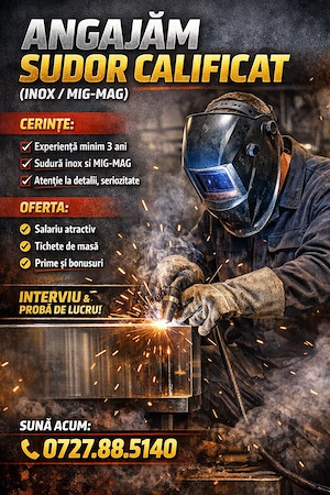 Suntem în căutarea unui sudor calificat, responsabil și atent la detalii, care să se alăture echipei noastre profesioniste. Căutăm o persoană cu experiență în sudură inox (lucrări de finețe) și sau sudură MIG-MAG, capabilă să livreze lucrări de calitate, respectând standardele tehnice și normele de siguranță. Cerințe: ...