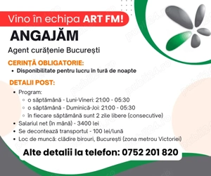 Ai domiciliul stabil în București și vrei să muncești la curățenie? Dacă ai răspuns DA, iată ce avem disponibil: Agent curățenie pentru tura de noapte: Program: o săptămână: Luni-Vineri: 21:00 - 05:30 și o săptămână: Duminică-Joi: 21:00 - 05:30. În fiecare săptămână sunt 2 zile libere (consecutive) - ...