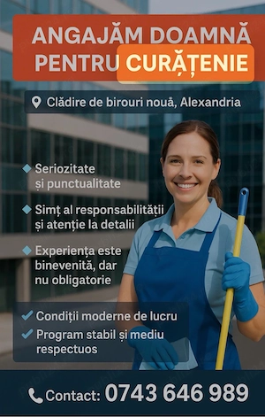 Angajăm Doamnă pentru Curățenie din Alexandria pentru Clădire de Birouri nouă, Alexandria Căutăm o doamnă harnică și de încredere pentru curățenie într-o clădire de birouri nou construită, amenajată la standarde europene, în Alexandria. Profil: - experiența în curățenie minim 3 ani - domiciliul ...