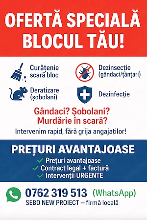 Oferim servicii complete de curățenie și DDD (deratizare, dezinsecție, dezinfecție) pentru asociații de proprietari, blocuri și spații comune. Ne ocupăm de întreținerea periodică a scărilor de bloc, asigurând un mediu curat, igienizat și sigur pentru toți locatarii. Activitățile includ măturat și spălat ...
