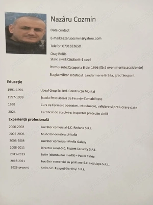 Posesor permis categoria B din anul 1996, cu experienta si fara accidente si evenimente , cu fff.multti km facuti si condus zilnic, sunt disponibil zilnic pentru Constanta, Bucuresti,...judet....etc.Data nasterii 1 Aprile 1977, Casatorit, 1 copil Stagiul Militar satisfacut..Jandarmerie Braila Grad Sergent!Seriozitate, ...
